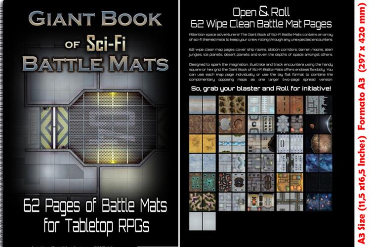 Apri il libro e crea immediatamente l'area dell'incontro! Questo libro permette ai DM e ai giocatori dei giochi di ruolo di fantascienza di godere di tutti i vantaggi che il Big Book of Battle Mats porta ai giocatori di Fantasy RPG! Progettato per mantenere la tua partita vivo e vibrante, anche quando giochi con i tavoli più stretti, la gamma dei Battle Mat Books offre una flessibilità unica. Con la rilegatura a spirale, i libri sono si aprono in maniera totalmente piatta per raddoppiare le dimensioni della mappa, oppure possono essere utilizzati una pagina alla volta per gli incontri più piccoli o dove lo spazio è stretto. Questo libro presenta molti mappe modulari che possono essere allineati su più libri per un'avventura davvero epica !! Grande Formato A3 pratico e portatile (420x297 mm) 62 pagine formato A3 di playmat a tema fantascientifico laminate in modo da poter essere disegnate con pennarelli per dryboard e poi ripulite con una pezzuola umida. Griglia da 1 pollice o esagonale come parte del design o sovrapposta. La rilegatura a spirale consente di appiattire il libro e di utilizzarlo sia a pagina singola sia a doppia pagina come singolo terreno di gioco. Disegni che spaziano da scenari di stelle, stazioni spaziali, campi di asteroidi, pianeti alieni, navi spaziali in rovina e altro ancora.